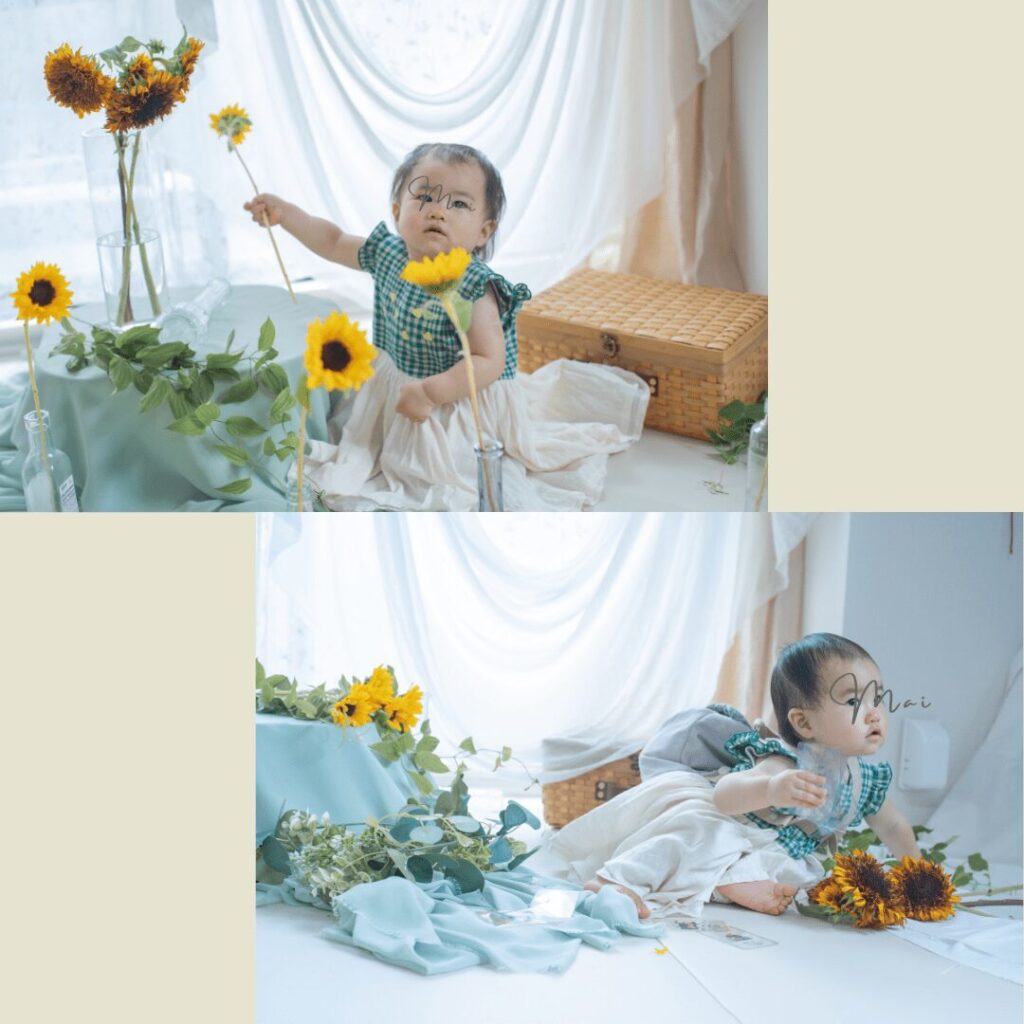 - ファーストバースデーおうちフォトブースの見本&こだわりポイント